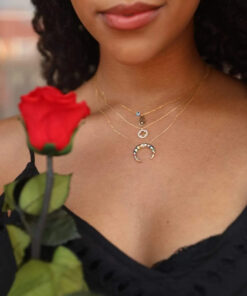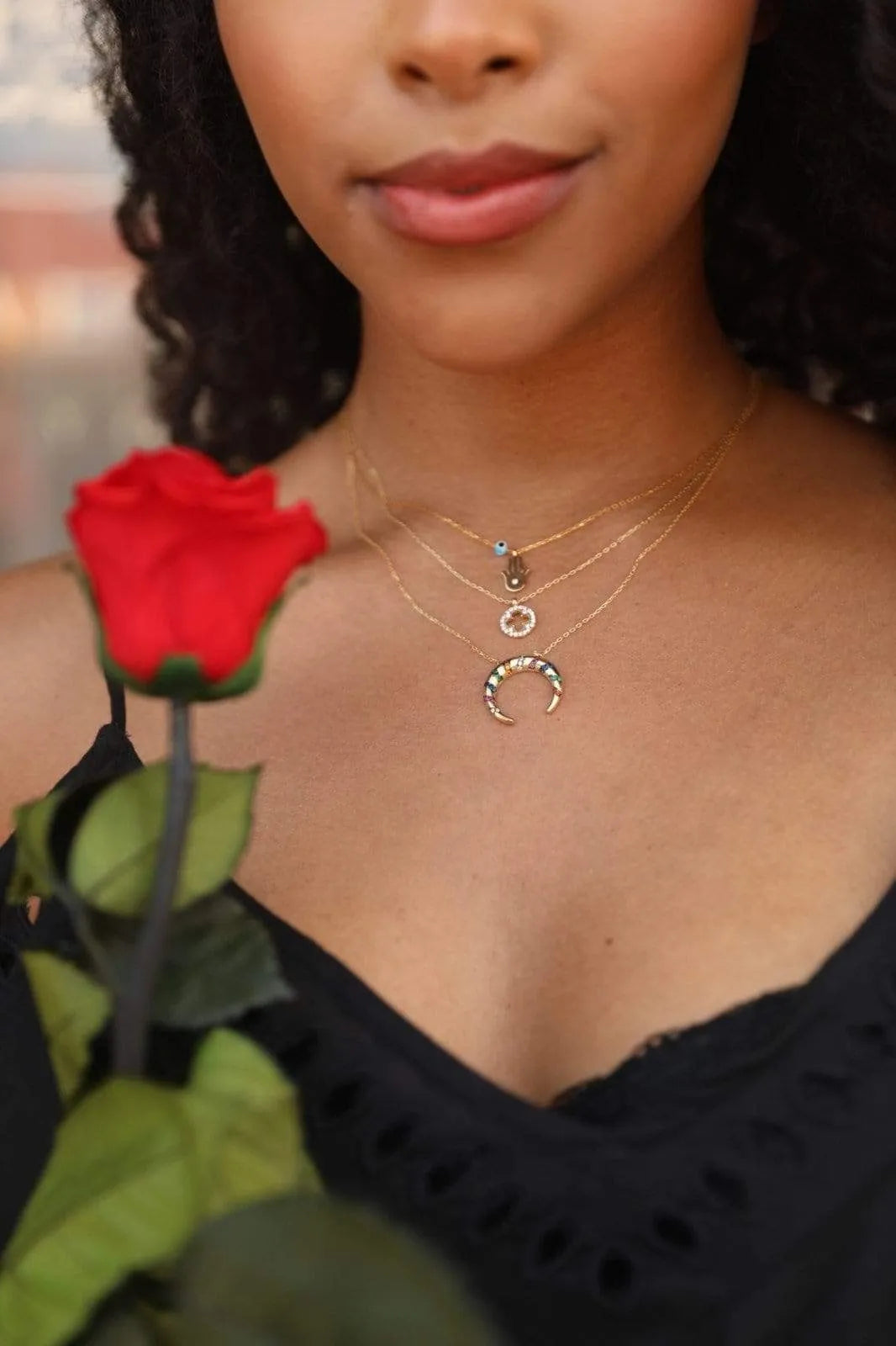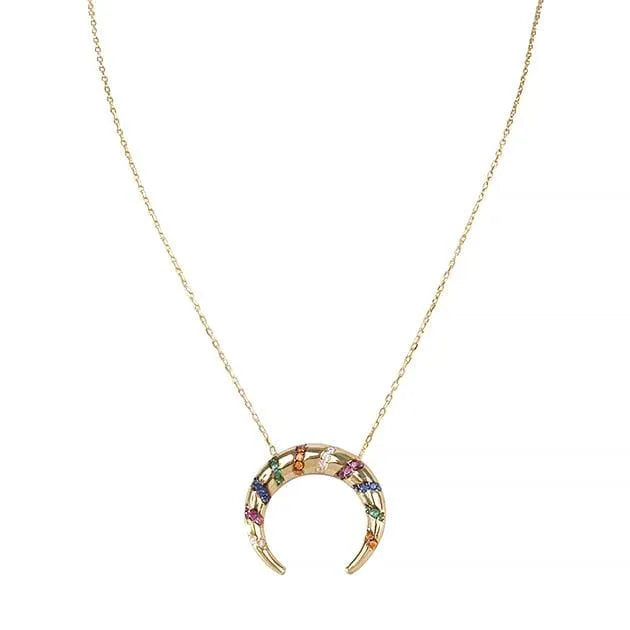 This playful Half Moon Necklace have been micro-paved with multicolored stones for a perfect statement piece.  It will dress up any outfit to perfection or make a great gift for birthdays, anniversaries, holidays, graduation bat mitzvah, or just because.  All jewelry is handmade, providing the highest quality of materials.
