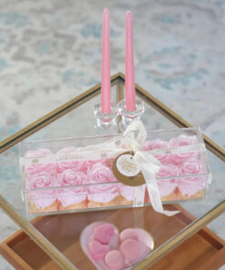 Twelve perfectly preserved pink roses in a stunning clear acrylic box with a stunning gold base. The box contains twelve eternal aesthetic roses in the color of your choice. Perfect gift that can be displayed as a centerpiece, on a nightstand, vanity or any space where color and scent is needed.