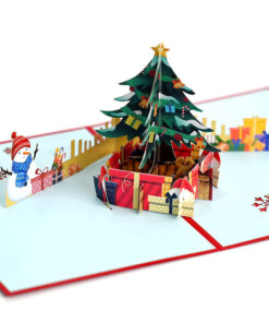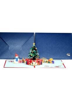 “Have a Holly Jolly Christmas” is what your green cover of the Santa pop-up card welcomes your loved ones with. Once opened, a cozy Christmas background extends in 3D. Santa Clause is poised at the top of a ladder, carefully putting a golden star at the top of a beautifully embellished tree. Santa’s assistant, a crank in the cutest of elf uniforms, counts one more gift to the packages on the carpet underneath. Behind the tree, a fireplace heats the room, and a yellow armchair asks you to have a seat.